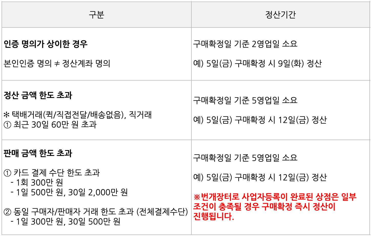 단, 다음의 경우 추가 정산 기간이 발생할 수 있습니다.[프로상점 당일 정산 불가 케이스]