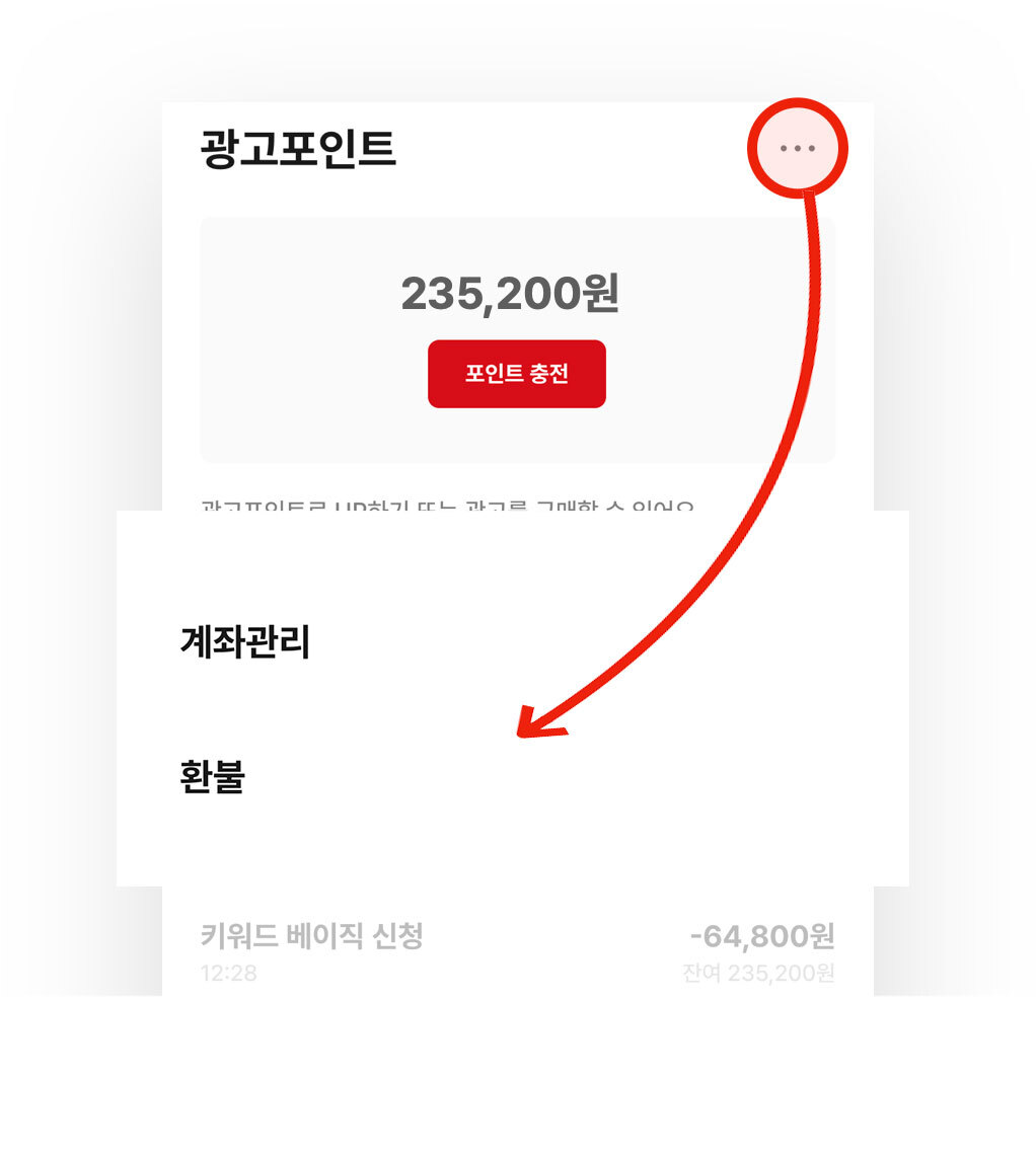 광고 포인트 관리 페이지에서 환불 정책에 따라 남은 광고 포인트를 환불받을 수 있습니다.광고 포인트 환불광고 포인트에서 더보기 메뉴를 클릭하면 환불 메뉴를 확인할 수 있습니다.
