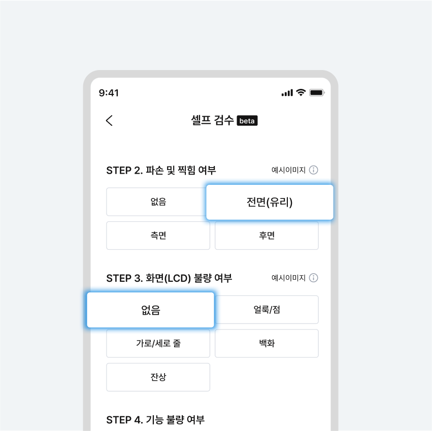 파손 및 찍힘, 화면(LCD) 불량, 기능 불량 등