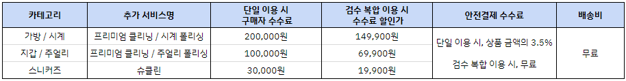 카테고리에 따라 클리닝 서비스 수수료는 상이하며, 검수와 클리닝 서비스를 함께 이용 할 경우 할인 금액이 적용됩니다.