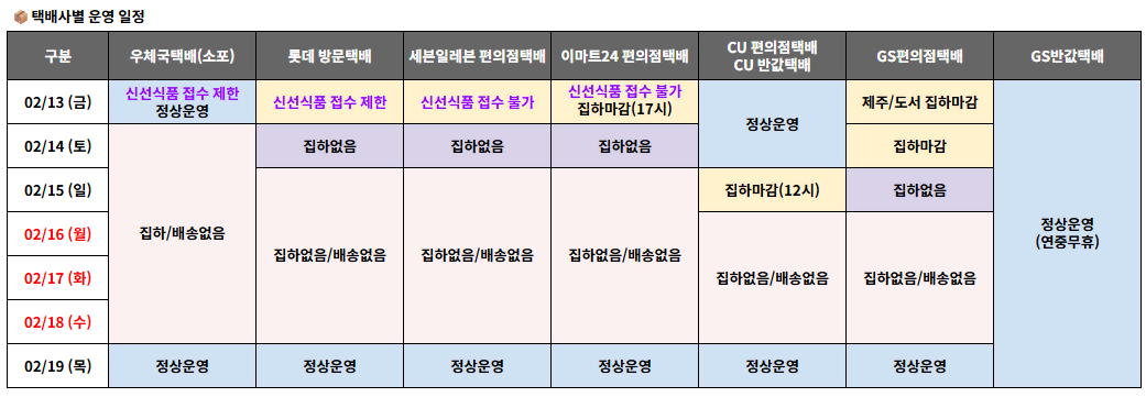 02월 19일(목)부터 집하 재개되오니, 거래에 차질 없으시도록 아래의 일정을 참고하여 주세요.