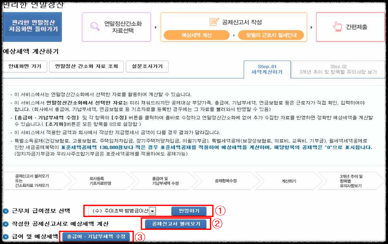 ○ 공제신고서 작성 후 예상세액 계산하기로 이동하기