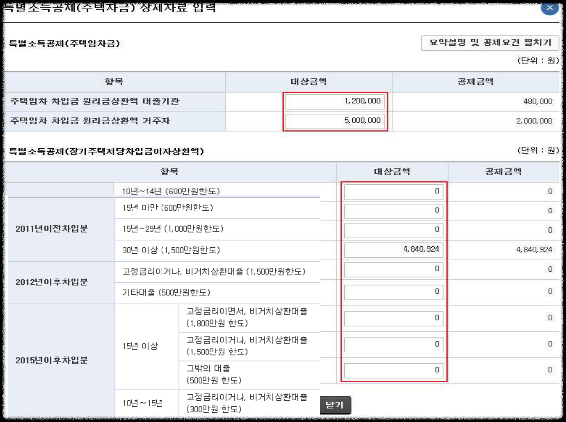 - 각 항목에 해당하는 공제대상 금액을 입력합니다.