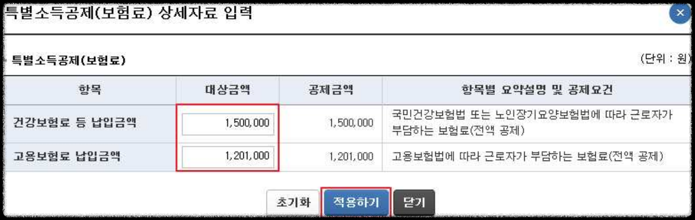 - 각 항목에 공제금액을 입력한 후 ‘적용하기’를 누르면 반영됩니다.