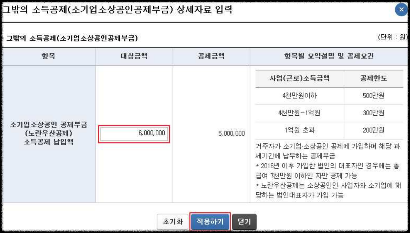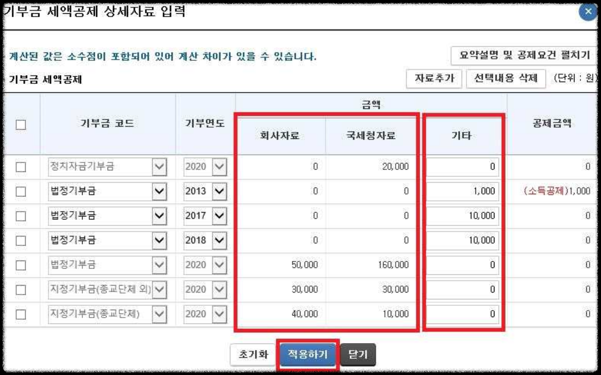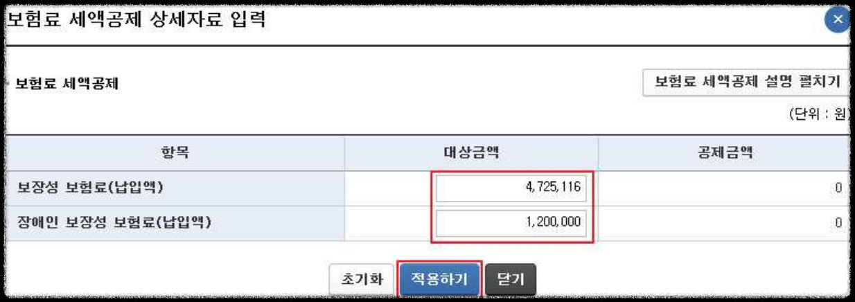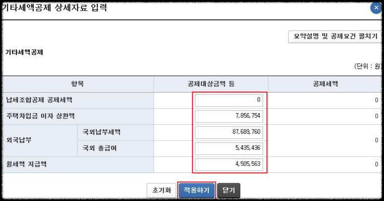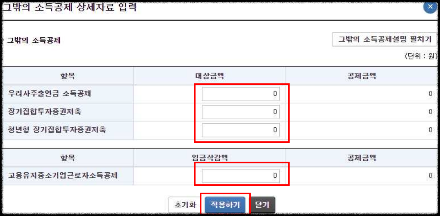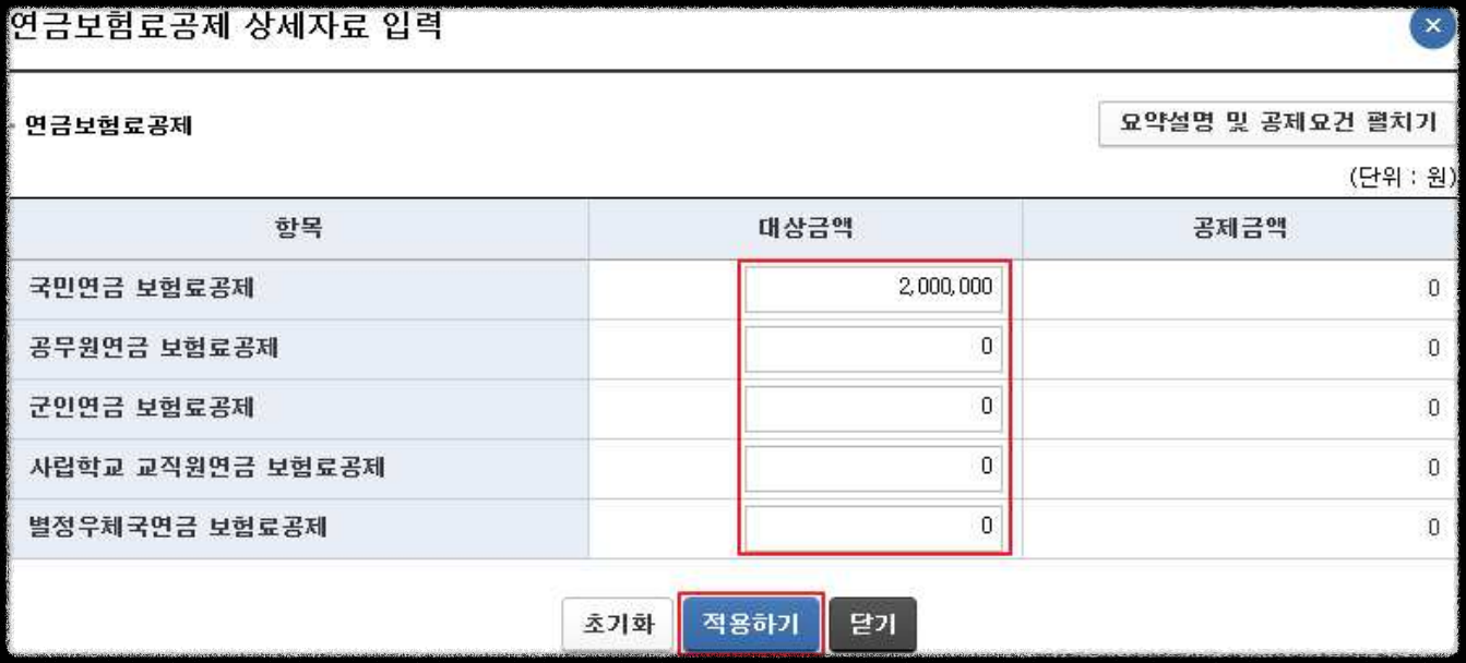 - 각 항목에 공제대상금액 등을 입력한 후 ‘적용하기’를 누르면 반영됩니다.