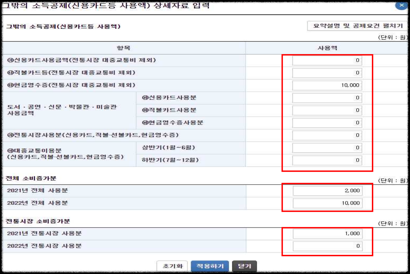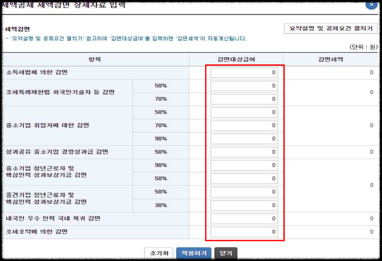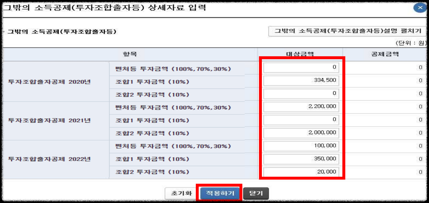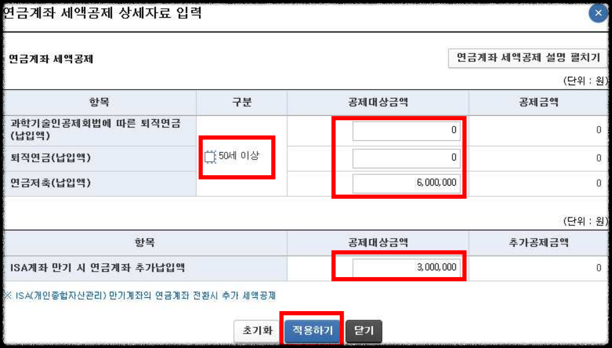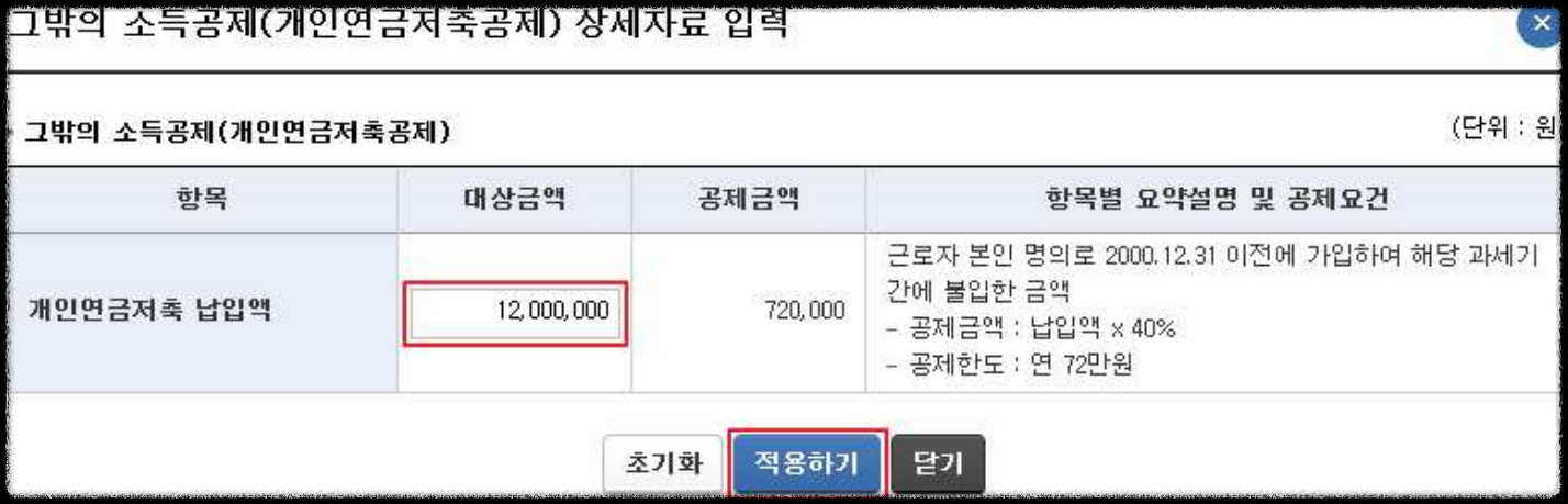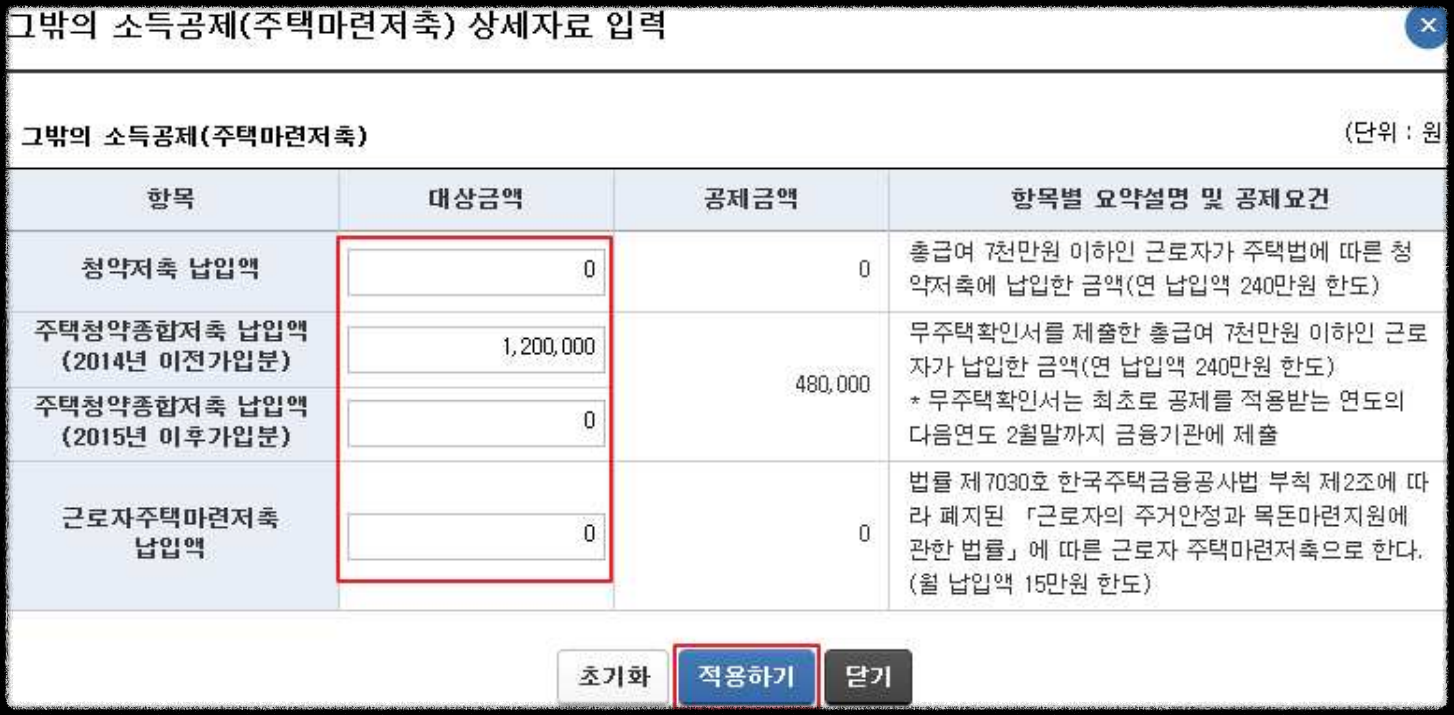 - 각 항목에 공제대상금액 등을 입력한 후 ‘적용하기’를 누르면 반영됩니다.