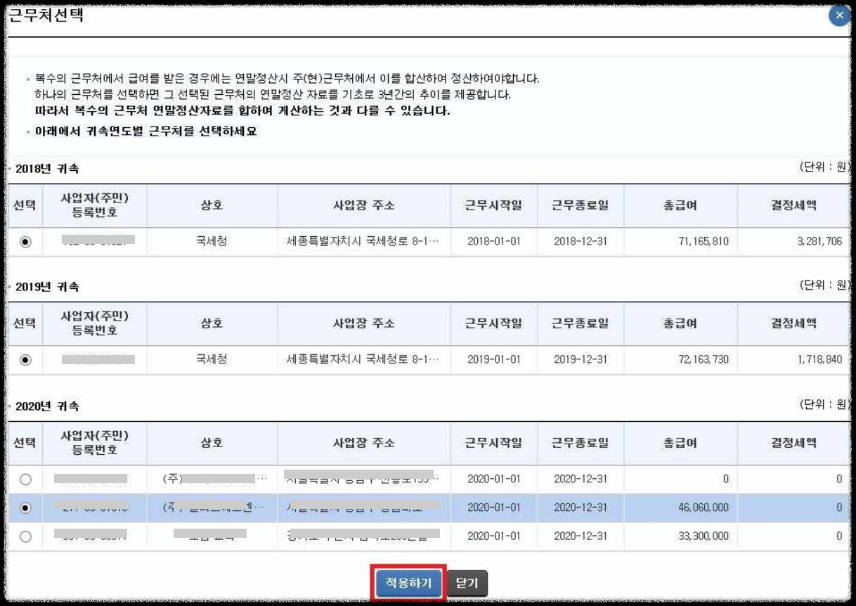 ① 회사선택 후 반영하기 : 회사에서 제출한 총급여⋅기납부세액 등의 자료를 반영합니다.