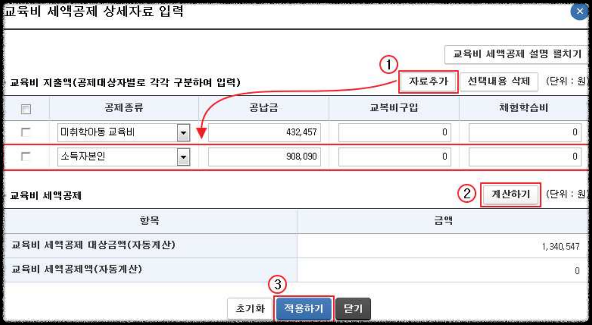 ○ 교육비 세액공제 - ‘수정’ 클릭 시 나타나는 팝업