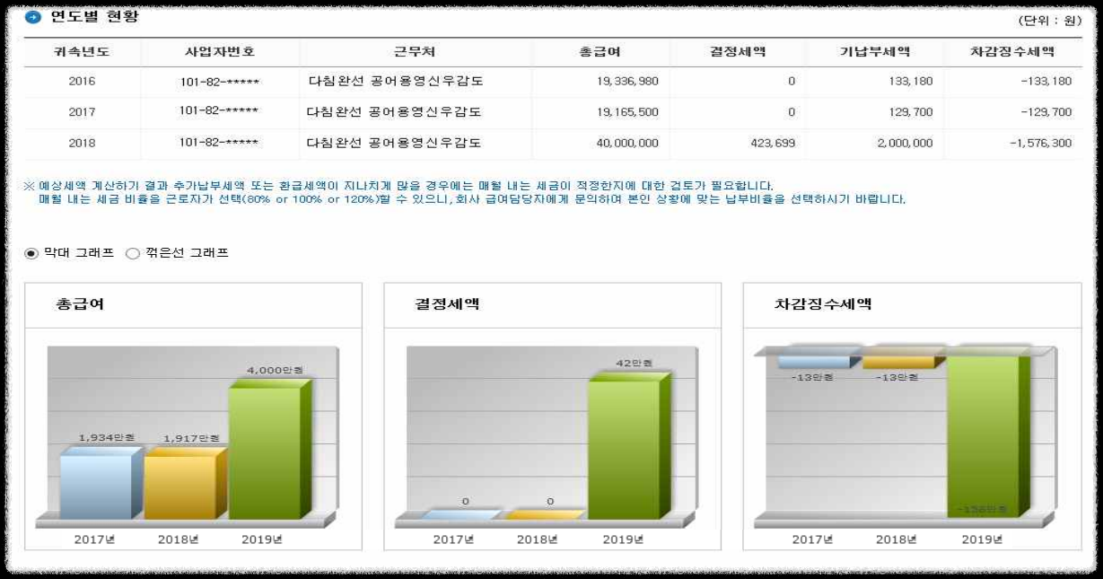 ○ [예상세액 계산하기]에서 작성된 내용을 바탕으로 최근 3년간의 연말정산 내용과 비교하여 추세를 살펴보는 화면입니다.