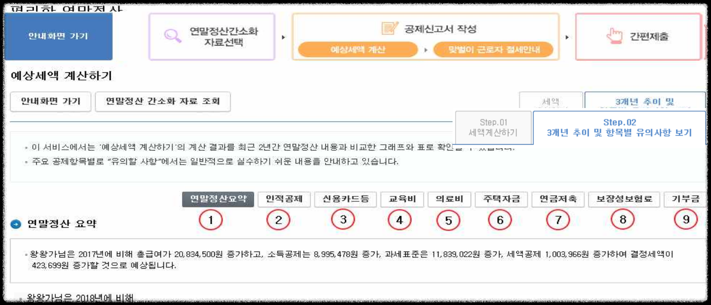 - Step.02 3개년 추이 및 항목별 유의사항 보기 화면에서는 소득⋅세액공제 항목별 3년간 변동 현황을 확인할 수 있습니다.