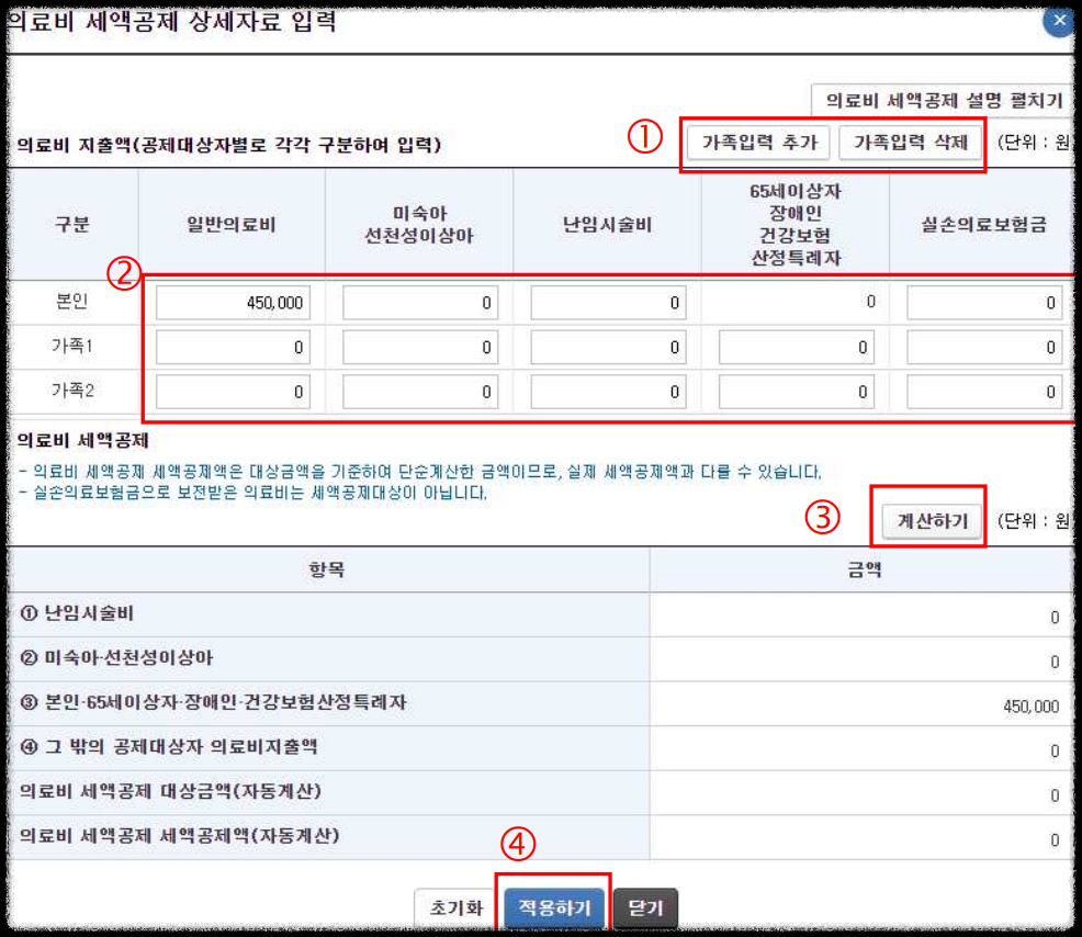 ① 부양가족 수에 따라 가족입력란을 추가하거나 삭제합니다.