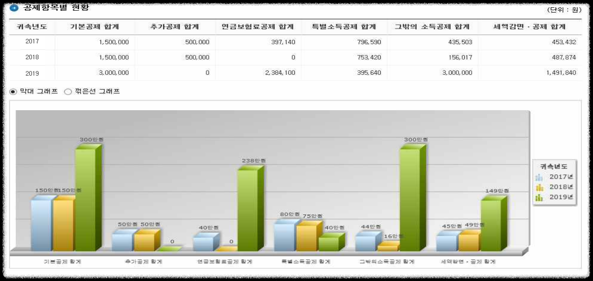 ② 인적공제 : 부양가족 공제액 등 인적공제 변동현황을 표와 그래프로 보여줍니다.