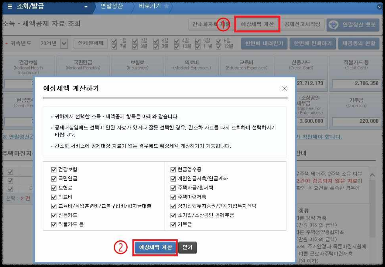 ○ 간소화자료 선택 후 예상세액 계산하기로 이동하기