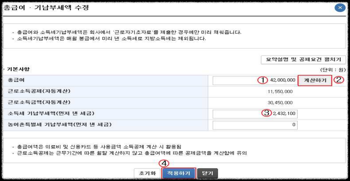 - 각 항목에서 적용하기를 하고 최종적으로 계산하기를 선택해야 세액이 계산됩니다.