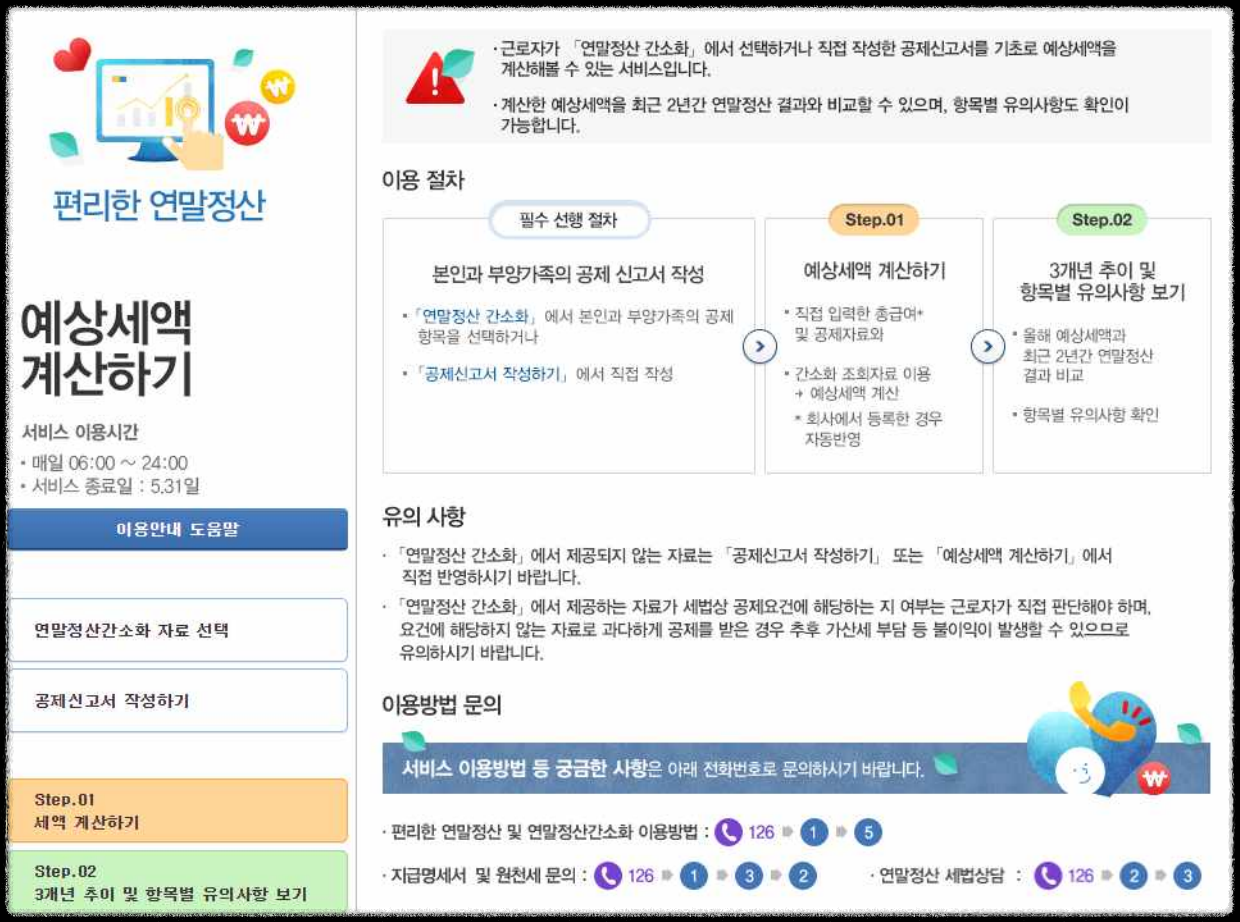 - 예상세액 계산하기 서비스는 소득⋅세액공제 자료조회 화면 (연말정산 간소화)에서 공제항목을 선택한 후, 또는 공제 신고서를 작성한 후 이용합니다.