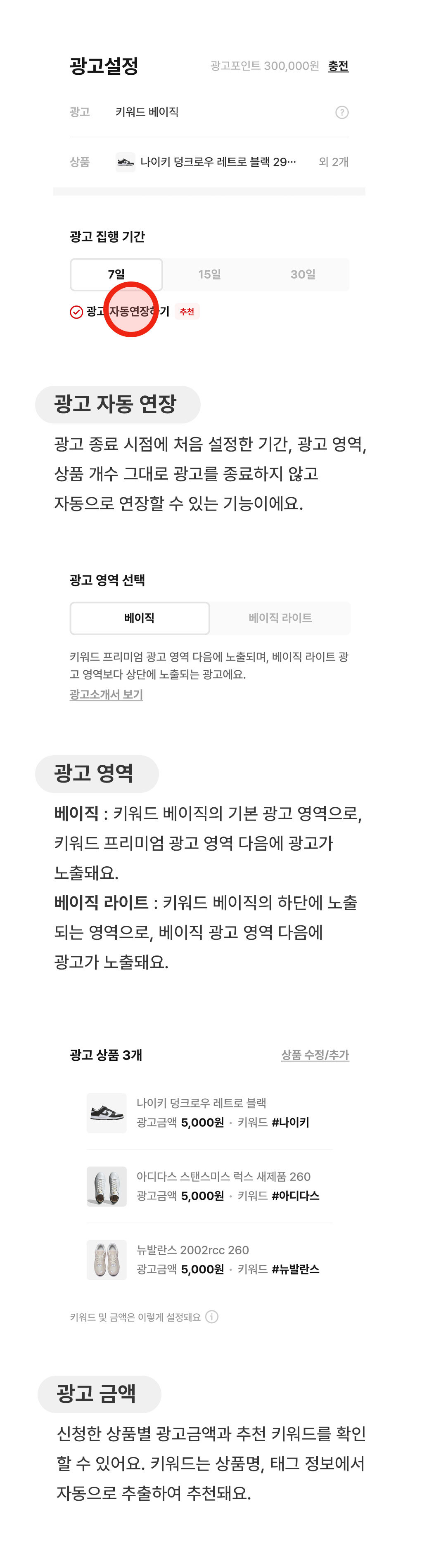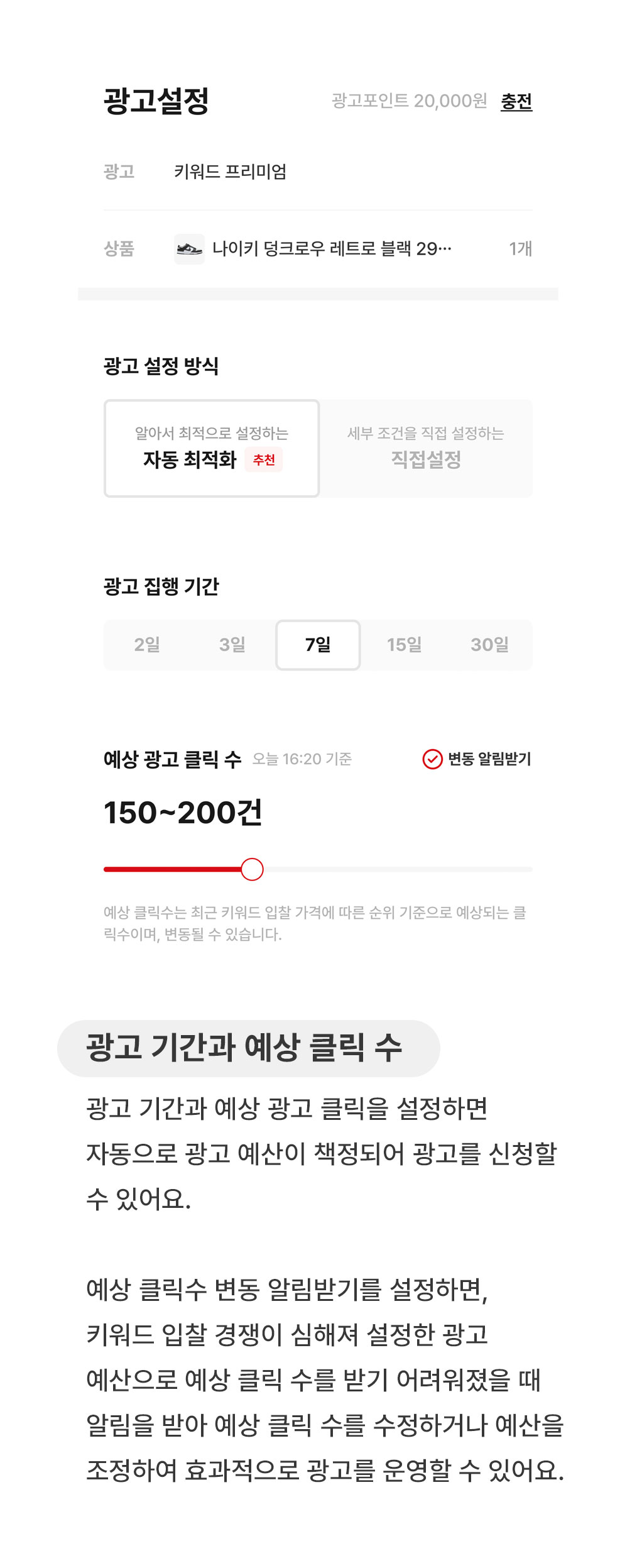 자동 최적화 : 광고 진행에 필요한 키워드와 입찰가, 타겟 등을 자동으로 설정하여 손쉽게 광고할 수 있어요. 키워드 프리미엄 광고가 처음이거나, 많은 상품을 광고하는 판매자에게 추천해요