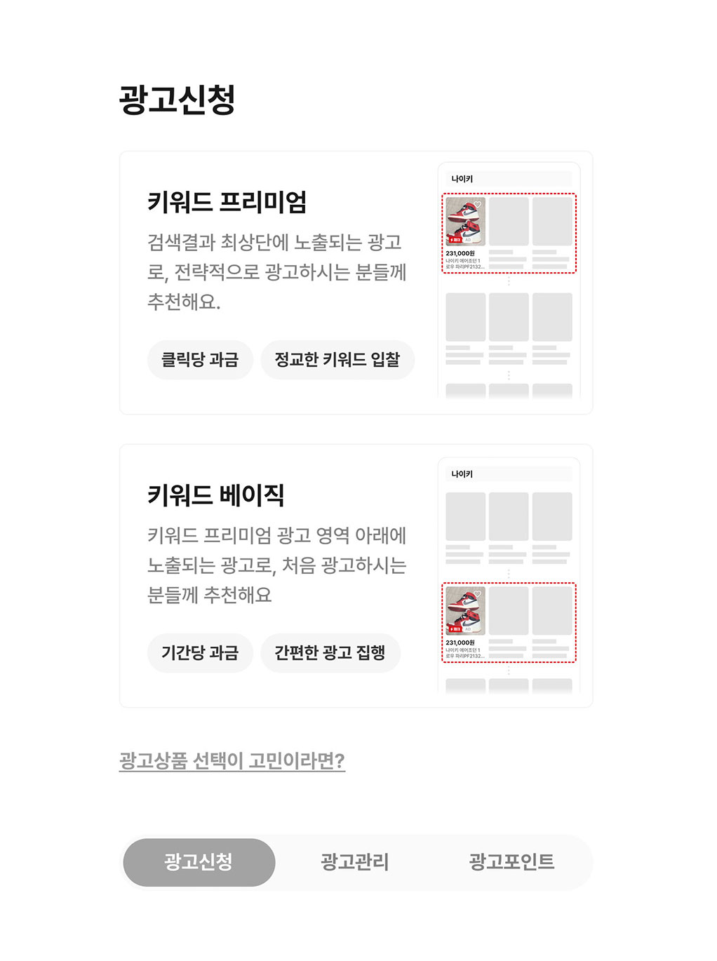 광고 전략에 맞는 광고 상품을 선택하세요.