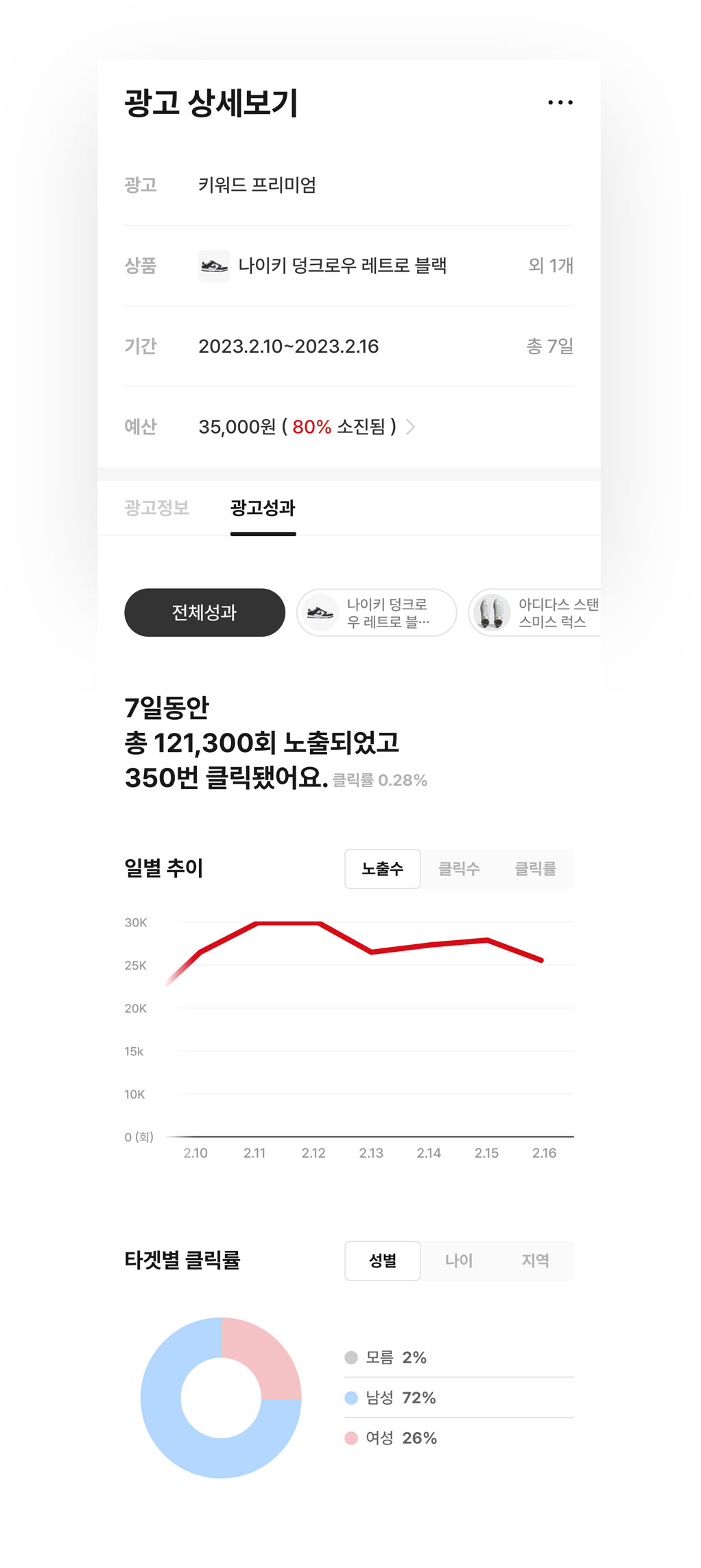 노출 지면 상단에 노출되기 때문에 내 상품을 상위에 노출하고 싶거나, 다양한 설정으로 전략적인 광고 운영을 원하는 판매자에게 추천하는 광고에요