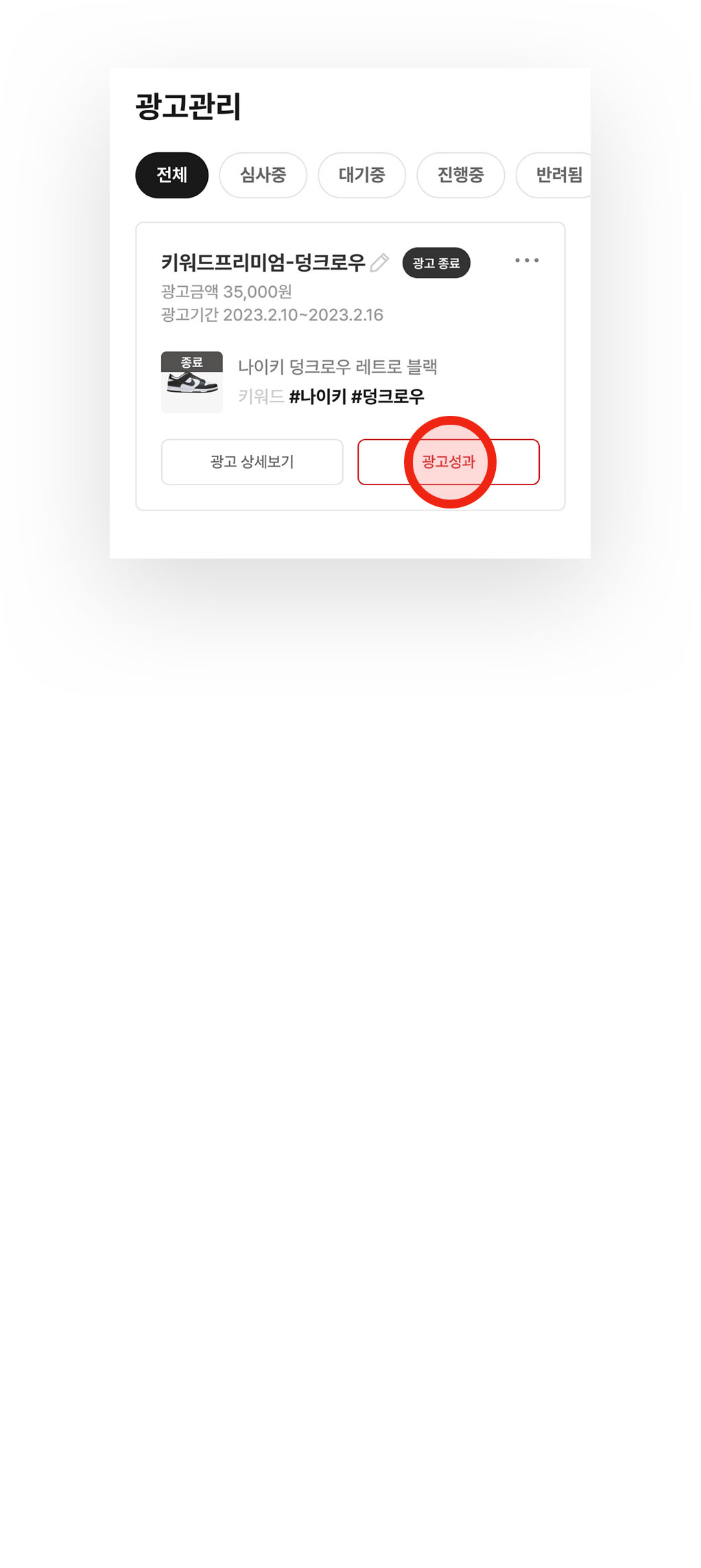 광고 관리에서 광고 진행중 및 종료된 광고의 성과를 확인할 수 있어요.