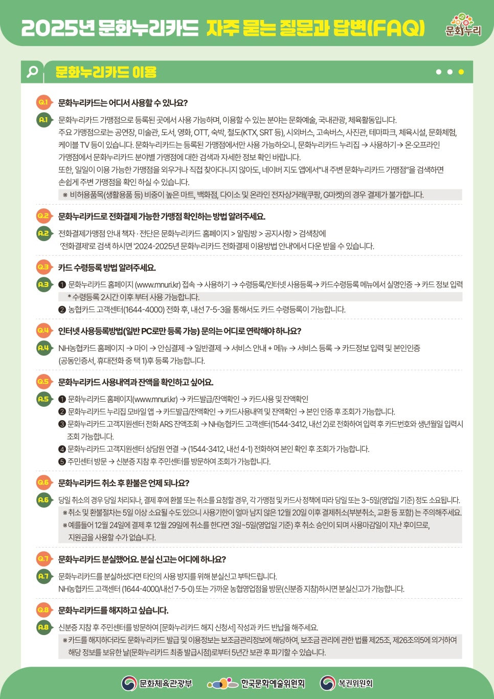 2025년 문화누리카드 자주묻는 질문과 답변(FAQ) 글로 확인하기